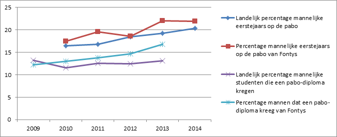 Hoewel mannen op de pabo nog steeds in de minderheid zijn, lijkt het de goede kant op te gaan. Landelijk was in 2010 nog 16,5 procent van de eerstejaars pabo-studenten man, in 2015 was dat al 20,3 procent. Slechts dertien procent van de pabo-diploma’s die in 2013 werd uitgereikt was voor een meester.