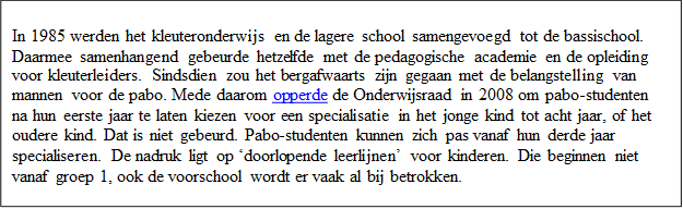 Jaren geleden besloot Fontys al dat het roer om moest. 'Ten eerste moeten er natuurlijk meer jongens voor de pabo kiezen. Maar als ze dat gedaan hebben, moeten we vooral voorkomen dat ze uitvallen. Na het eerste jaar waren er altijd relatief meer jongens dan meisjes weer verdwenen.'