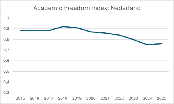 Ook wetenschapsgenootschap KNAW waarschuwde vorig jaar dat de academische vrijheid in Nederland onder druk staat, onder andere vanwege de forse bezuinigingen van het kabinet-Schoof en de ‘polarisering en verharding van het maatschappelijke debat’. De KNAW noemde daarbij ook de dalende score voor Nederland op de Academic Freedom Index.