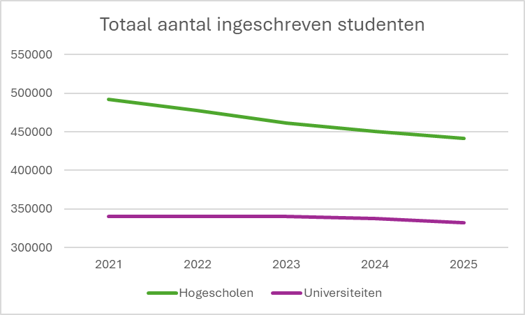 Kijk je naar de totale inschrijvingen in het hbo, dan wordt de trend zorgwekkender. Sinds 2021 daalt het aantal studenten met zo’n tien- tot vijftienduizend per jaar. Destijds stonden er 492 duizend studenten ingeschreven bij een hogeschool, nu zijn dit er nog maar 441 duizend.