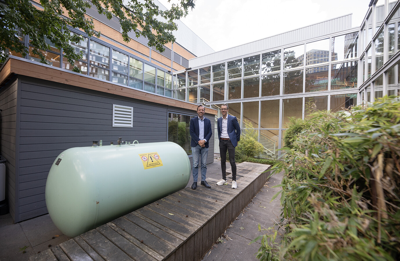 Met een lach van oor tot oor lopen Hermen Bollemaat, hogeschooldocent en initiatiefnemer van de installatie, en Arjan Brenkman, opleidingsmanager en aanjager van het project door de tuin van Heidelberglaan 7. In het midden doemt een lichtgroene tank op. Ernaast een ogenschijnlijk saai houten schuurtje. Daar gebeurt de magie. ‘Hier gooien we de etensresten in een machine, een biovergister, die ze omzet naar gas,’ legt Bollemaat uit. ‘Dat gas gaat naar de tank buiten. Precies passend in de duurzame koers van de HU.’