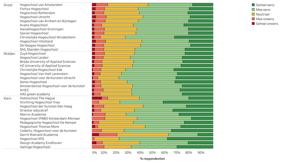 Heeft de onderwijsinstelling begrip voor de bijzondere omstandigheden? Ja, zegt ruim 60 procent, terwijl 11 procent nee antwoordt. De rest oordeelt neutraal. Bij kleine en middelgrote onderwijsinstellingen ervaren studenten over het algemeen meer begrip dan bij de grote. (Zie grafieken.)
