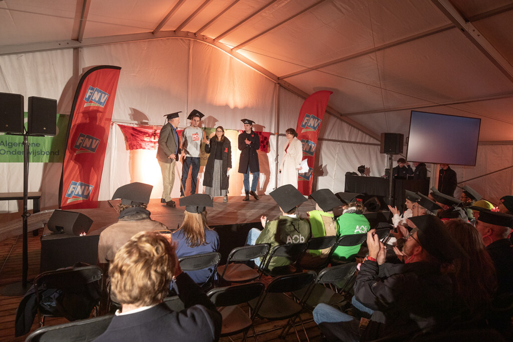Op het Domplein spraken de deelnemers na afloop van het debat nog wat na. Ze laten het er niet bij zitten. De Aob laat op Instagram weten 9 december in Amsterdam weer actie te gaan voeren tegen bezuinigingen in het hoger onderwijs.