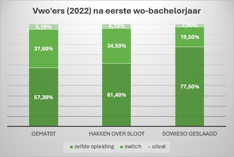 Aan de universiteiten nauwelijks. We hebben het voor de lichting van 2022 in een grafiek gezet. Hieronder zie je de situatie van drie groepen vwo’ers. Er blijkt maar een klein verschil tussen degenen die zijn ‘gematst’ en degenen die ‘met de hakken over de sloot’ zijn geslaagd. Het verschil met de rest (die met hogere cijfers is geslaagd) is een stuk groter.