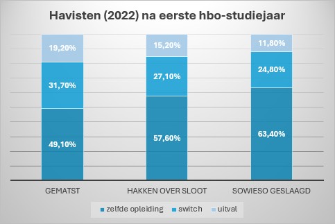 Daar is het verschil groter. Degenen die gematst zijn, bleven minder vaak aan dezelfde opleiding studeren. Voor havisten kun je inderdaad zeggen dat het versoepelde eindexamen vaker tot problemen in het vervolgonderwijs heeft geleid.