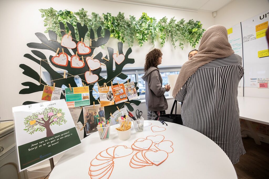 De tafels in de hal tonen projecten die de studenten hebben bedacht. Zoals de handleiding voor het leiden van een themagroep. Een stappenplan voor het openen van een zorgcafé. Of een creatieve workshop, waarin bewoners zich leren uitdrukken en verbinding ervaren.