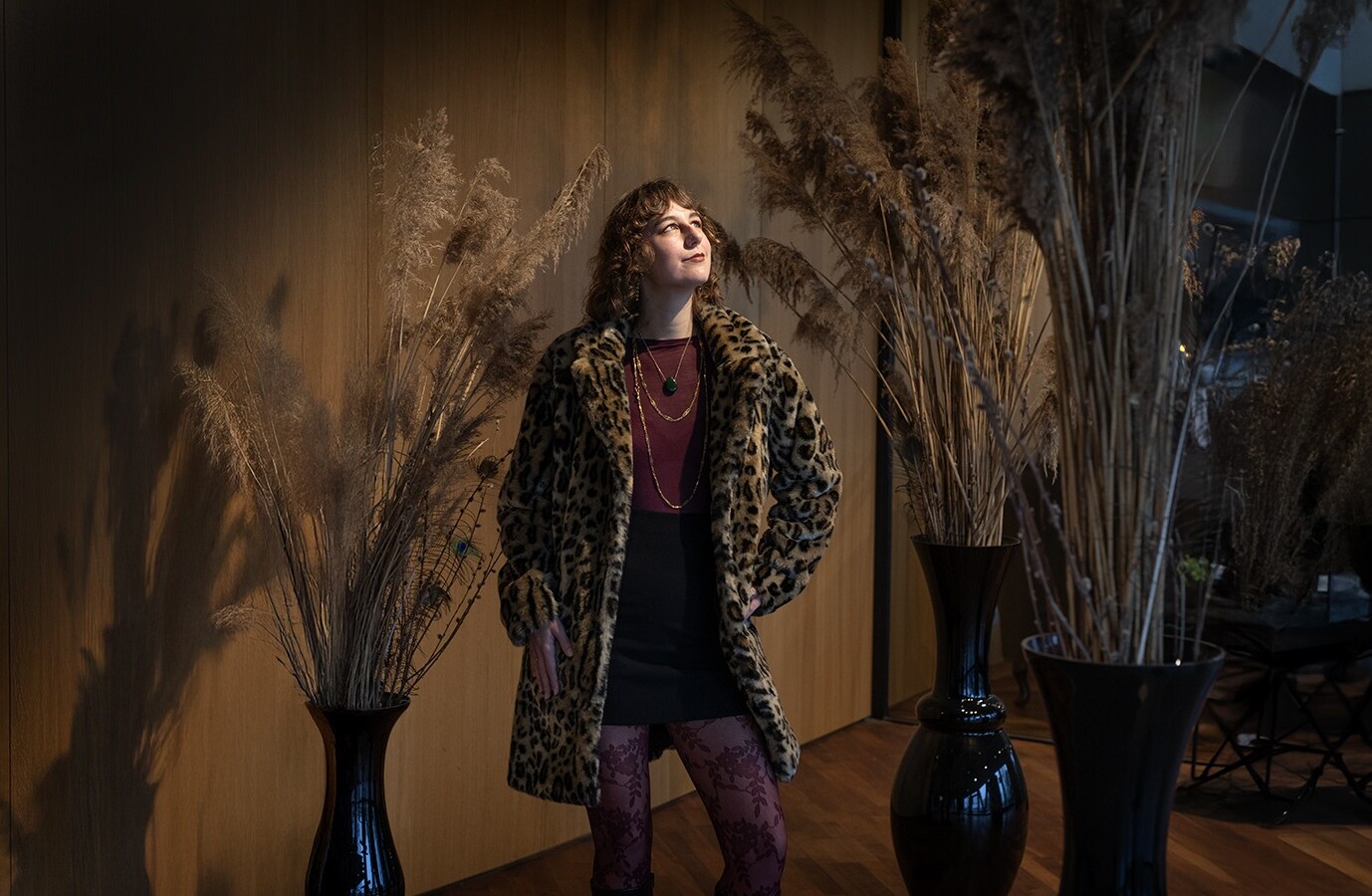 Welk kledingstuk draag je elke dag? ‘Mijn panterjas. Het wordt nu wat lastiger door het natte weer, want hij is niet waterdicht. Maar als ik hem kan dragen, ben ik helemaal blij. Hij past bij alles in mijn kast. Ik draag ook altijd deze armbandjes: één gekregen van een vriendin en één door een andere vriendin gemaakt.’