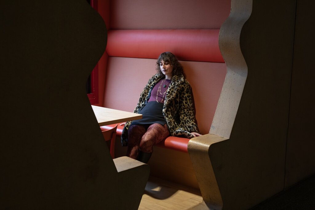 Wat doe je in je vrije tijd? ‘Ik werk in een wijnbar, heel leuk, al draag ik er werkkleding. Mijn zelfexpressie beperkt zich er tot make-up. Ik lees graag, schrijf, kook, kijk films en ga naar buiten, met bergschoenen en hoog opgetrokken wandelsokken.’