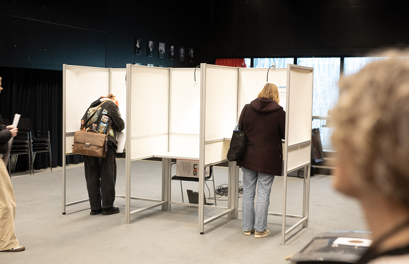 Terwijl de studenten in de stemhokjes bezig zijn met stemmen, worden ze nauwlettend in de gaten gehouden door een vrouw die, als een sfinx, over de stembiljetten waakt. ‘Wel even goed opvouwen,’ zegt ze, wanneer de eerste klaar is met invullen en het in de stembus wil gooien.
