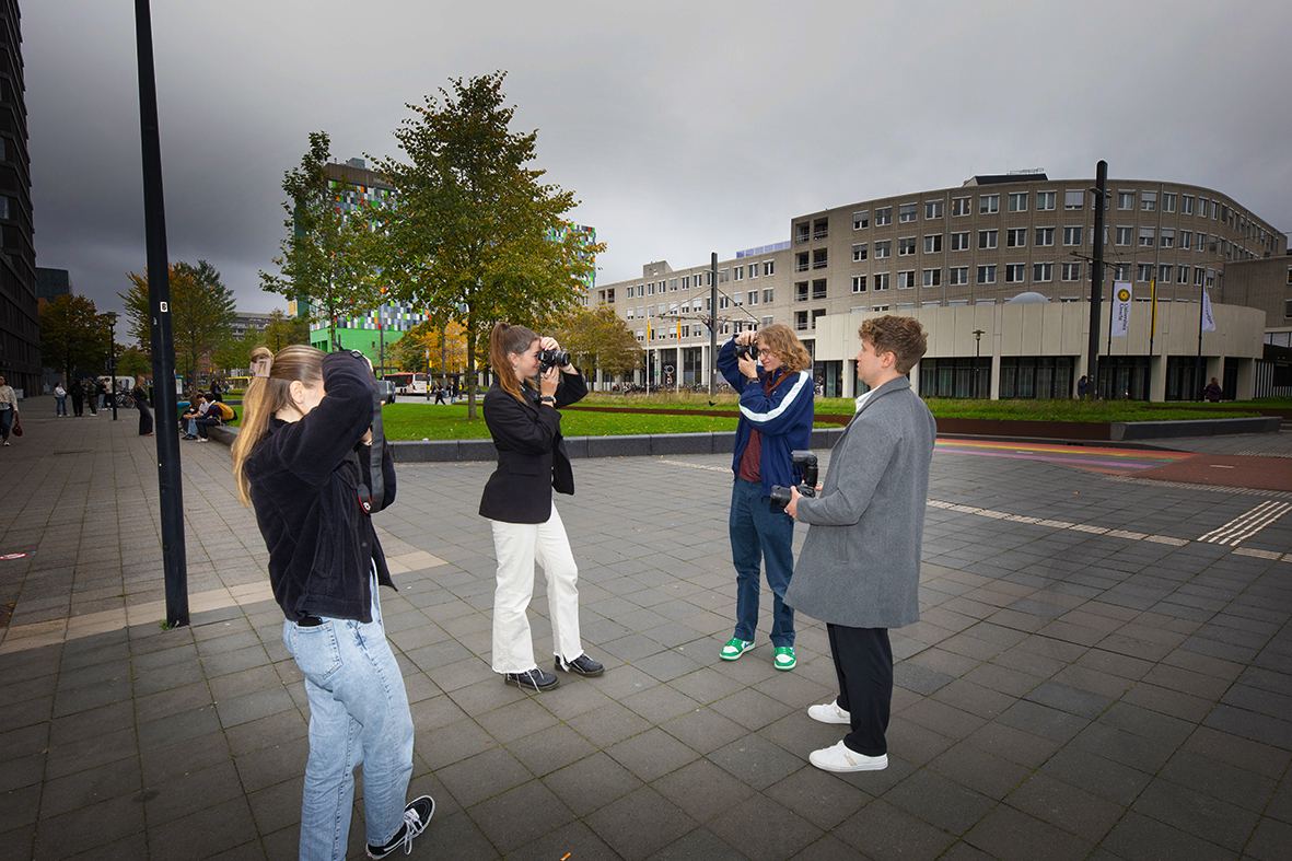 ‘Nee, nu niet bewegen!’ Het meisje in zwart-witte kleren staat op het punt af te drukken. Haar klasgenoot idem dito. De vier journalistiekstudenten staan op de stoep van Heidelberglaan 15. Op de achtergrond zien we een esdoorn, een stukje regenboogfietspad en het bestuursgebouw van de Universiteit Utrecht.