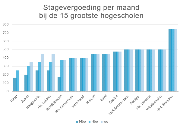 Het goede nieuws is dat alle dertig onderzochte hogescholen een stagevergoeding bieden. 21 scholen maken daarbij géén onderscheid naar opleidingsniveau. De gemiddelde stagevergoeding is bij die hogescholen 444 euro en dat bedrag zit ruim boven het landelijk gemiddelde voor mbo’ers (250 euro) en hbo’ers (380 euro).